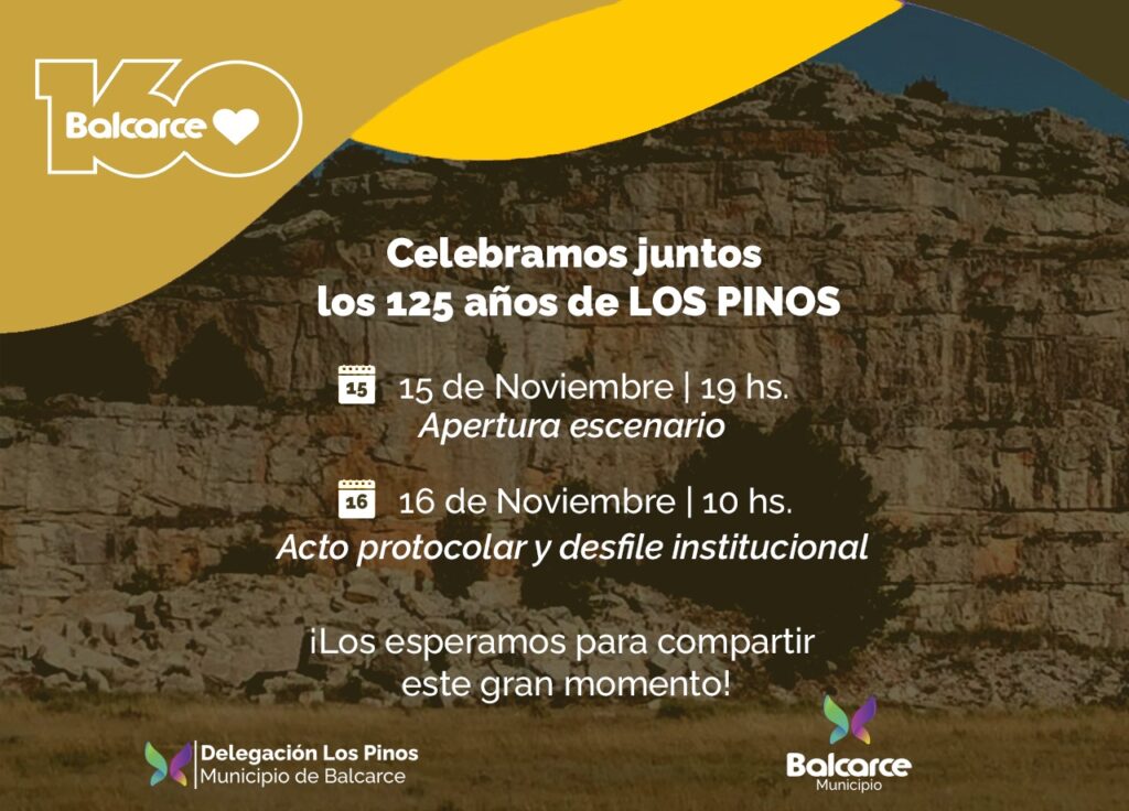 La localidad de Los Pinos se prepara para vivir un fin de semana inolvidable con motivo de su 125° aniversario de fundación, el 15 y 16 de noviembre en la plaza y sus adyacencias. Con entrada libre y gratuita, la propuesta invita a vecinos y visitantes a compartir dos jornadas cargadas de música, tradición y sentido de pertenencia.