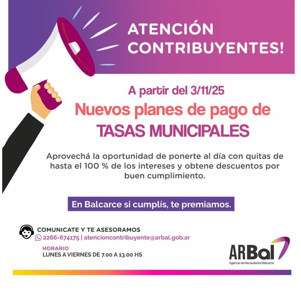 La Agencia de Recaudación Balcarce (ARBal) recuerda que desde el 3 de noviembre están habilitados los planes de pago que permiten regularizar obligaciones con importantes beneficios, entre ellos, quitas que alcanzan el ciento por ciento de los intereses acumulados.