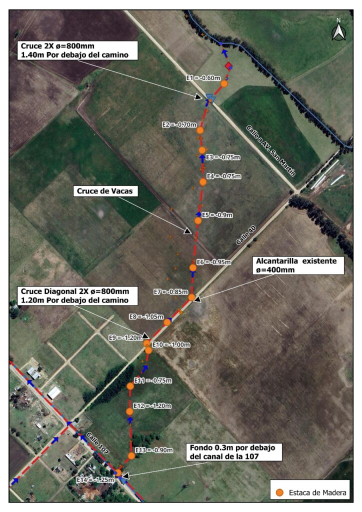 La tarea consiste en la construcción de un canal que inicia en ese punto, atraviesa un tramo rural de más de mil metros y desemboca en el arroyo “El Pantanoso”, en proximidades de la antigua Radio Balcarce, favoreciendo a barrios como “San Esteban” y “El Sapito”, entre otros. A lo largo de su recorrido se instalan tuberías de gran porte -de hasta 1000 milímetros- que permiten cruzar caminos sin interrumpir la circulación del agua. El diseño contempla pendientes controladas y una profundización gradual, desde 60 centímetros en su inicio hasta superar 1,25 metros al final del trayecto.