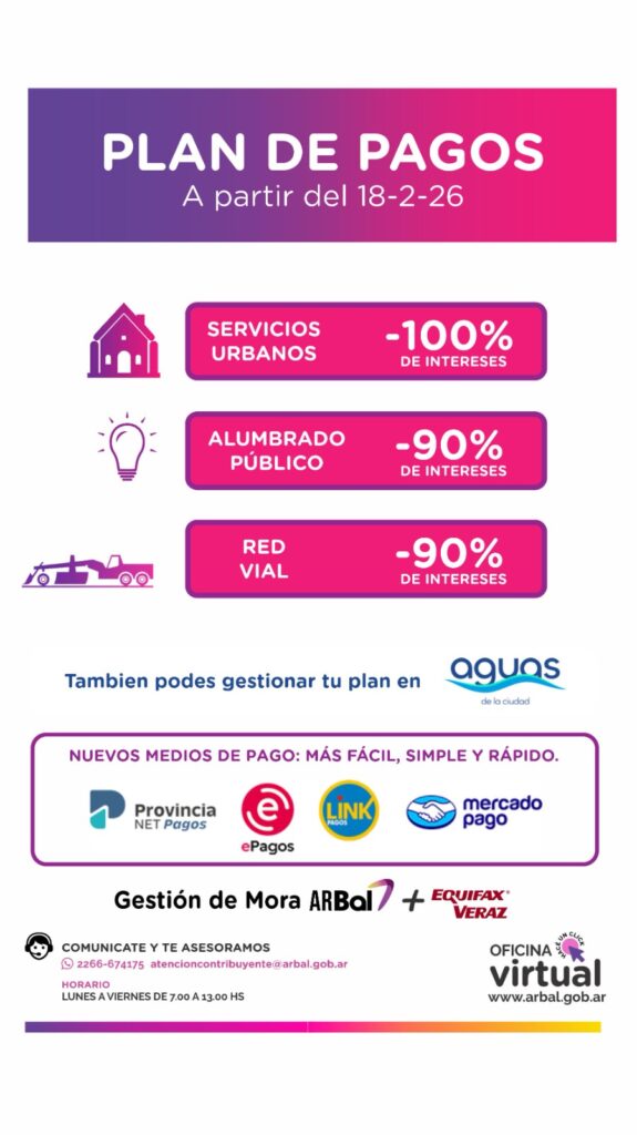 La Agencia de Recaudación Balcarce (ARBal) informa la implementación de nuevos planes de pago destinados a la regularización de tasas municipales correspondientes a servicios urbanos, alumbrado público, red vial y obras.
