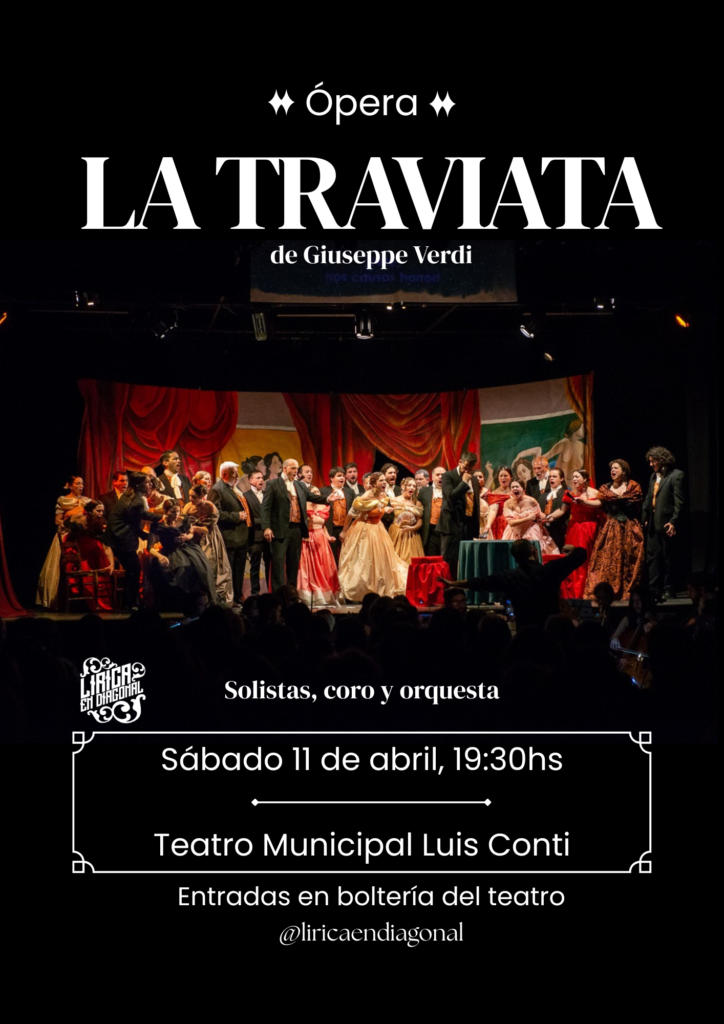 En tanto, el sábado 11 de abril, a las 19.30, subirá a escena “La Traviata”, ópera de Giuseppe Verdi, interpretada por la compañía Lírica en Diagonal. El elenco, que ya visitó la ciudad el año pasado con “Las Bodas de Fígaro”, ofrecerá una puesta integral con orquesta en vivo y cantantes en escena. El valor de la localidad general será de 25.000 pesos, con descuentos para jubilados y estudiantes de la Escuela de Arte.