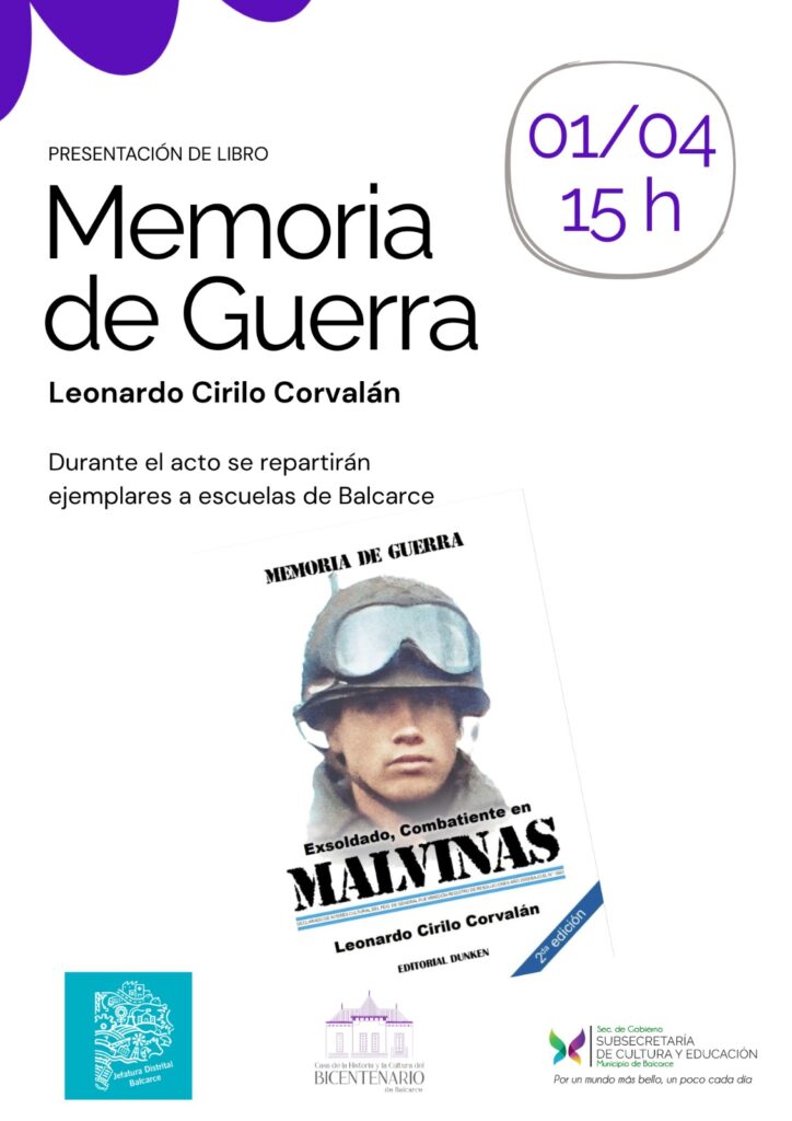 El miércoles 1 de abril, en la Casa del Bicentenario, se llevará a cabo la presentación del libro “Memoria de Guerra”, escrito por Leonardo Cirilo Corvalán.