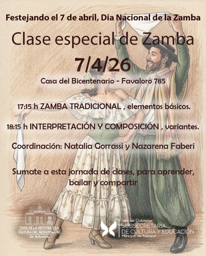 Este martes, en ocasión de la celebración del “Día Nacional de la Zamba”, habrá una clase especial de dicha danza folclórica argentina, a cumplirse en la Casa del Bicentenario, bajo la organización de la Subsecretaría de Cultura y Educación.
