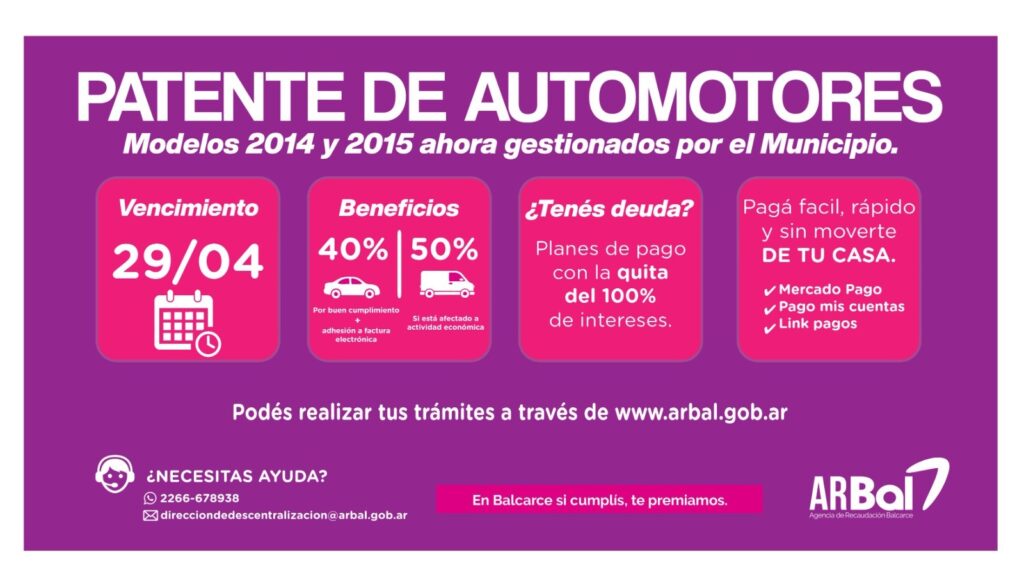La Agencia de Recaudación Balcarce (ARBal) informa a los contribuyentes que el vencimiento de la cuota 1 de la Patente de Automotores, correspondiente a los vehículos años 2014 y 2015 transferidos desde ARBA al ámbito municipal, opera el 29 de abril.